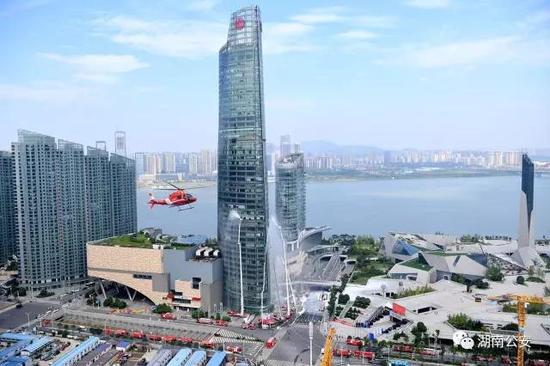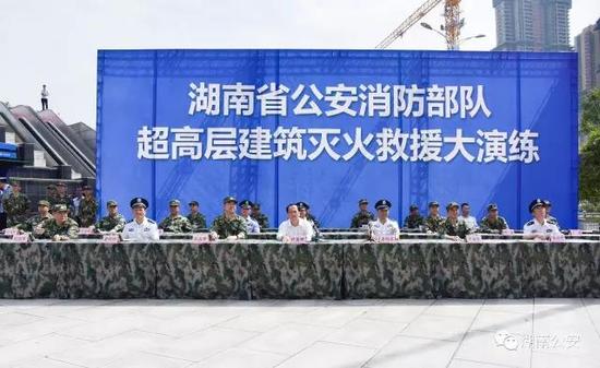 此次演练旨在检验湖南处置超高层建筑灭火救援的综合能力,长沙、株洲、湘潭、衡阳市公安消防支队,41台车艇,286名消防官兵以及应急、公安、环保、医疗等联动力量参与演练。