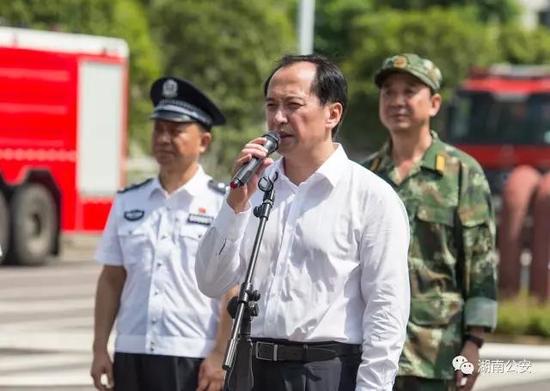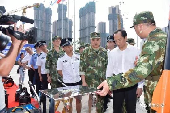 8月17日上午,湖南在长沙市北辰时代广场举行超高层建筑跨区域灭火救援实战演练,省政府党组成员、公安厅长许显辉现场观摩并慰问参演消防官兵,省公安厅副厅长汤向荣,长沙市副市长、公安局长唐向阳及湖南省公安消防总队主要领导现场指挥调度。