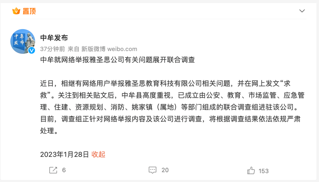 1月28日,@中牟发布 回应:联合调查组已进驻雅圣思教育科技有限公司,将根据调查结果依法依规严肃处理。