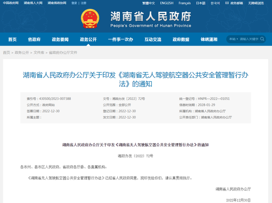 关注省政府办公厅网站1月28日公布《湖南省无人驾驶航空器公共安全管理暂行办法》(以下简称“暂行办法”)。