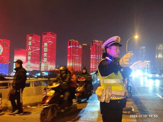 (通讯员 刘思言)“向人民警察致敬!”2024年1月10日晚7时,湖南省会长沙湘江两岸高楼被“点亮”,夜色下岳麓山在灯光的映衬下若隐若现,湘江波光粼粼倒映着璀璨的光幕,仿佛一条璀璨的玉带蜿蜒穿过长沙城区。