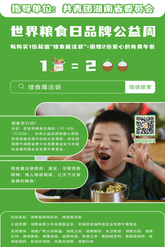 2021年10月16日是第41届“世界粮食日”,在共青团湖南省委员会指导下,湖南省烘焙协会携手惜食魔法袋共同发起[品牌公益周]。各爱心品牌企业将门店每天超量供给的商品通过惜食魔法袋义卖,所得善款捐赠予中国社会福利基金会免费午餐基金和湖南省青少年发展基金。