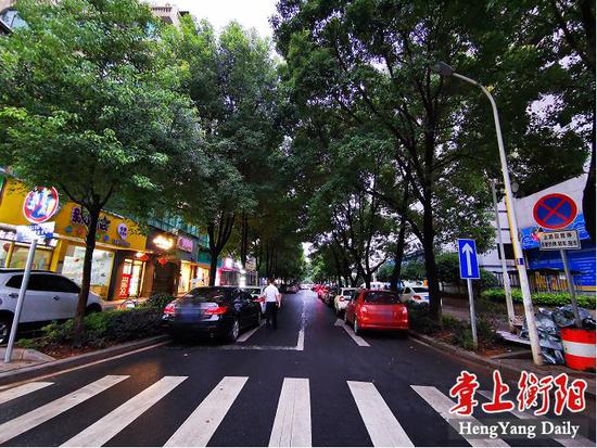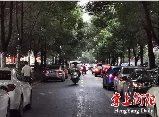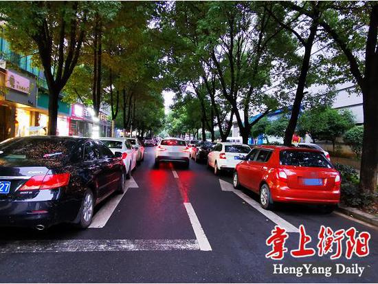 7月7日晚7时左右,记者接到市民投诉后来到双石街,发现街道两端均树立了全路段禁停标牌,但车辆依然照停不误。由于路两边都停了车,原本可以并行三台车的路面被挤占得剩一个车道,而步步高衡阳店地下停车场的出口位于双石街北端,从地下停车场出来的车辆较多,经常与从双石街经过的车辆形成抢道,导致整条街道通行困难。