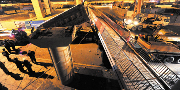 昨晚22时30分左右,长沙万家丽北路月湖公园路段,一座人行天桥被渣土车撞倒,救援人员使用吊车在进行救援。王志伟 摄