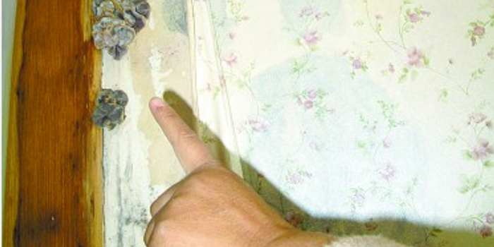 在小区2栋6楼谢女士的家中,渗水的情况就更加严重。除了部分墙壁发霉外,有的墙布因为受潮而脱落。更让人惊讶的是,在她家卧室墙壁的一侧,居然还长出了好多菌子,细数一下有六七处。谢女士说,这个房子原来是准备给她儿子结婚用的,儿子看到这个情况后干脆不住这里了。