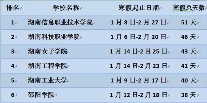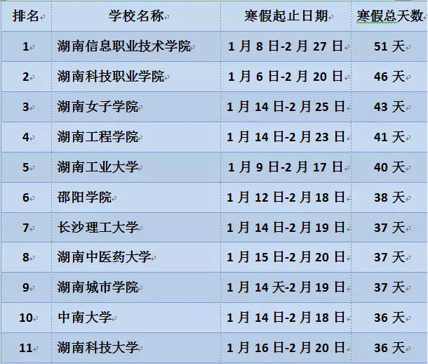 注:本排行榜仅供参考,本表信息来源各高校官网及校历显示,具体放假时间请以各高校各个学院及专业实际通知为准。部分高校因为有学校官网上没校历,所以未能列入排行榜。(来源:长沙校园)