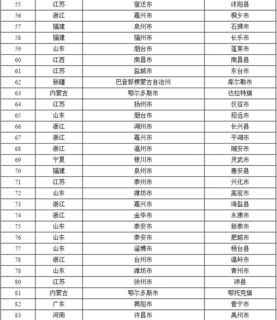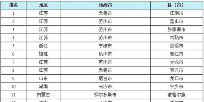 从数量分布看,工业百强县(市)分布于17个省(自治区),苏鲁浙等经济大省继续领跑,江苏24个,山东21个,浙江15个,河南10个,福建7个,内蒙古5个,湖南4个,湖北3个,广东、河北各2个,陕西、贵州、江西,宁夏,新疆、辽宁、安徽各1个。十强依次是江阴市、昆山市、张家港市、常熟市、慈溪市、晋江市、太仓市、宜兴市、龙口市和宁乡市。四强排名基本稳定,连续三年居前四名,排名变化不超过1;慈溪市排名继续提升,进入五强;宜兴市、宁乡市首次跻身十强;准格尔旗、广饶县继神木市和瓦房店市于2016年退出十强后,2017年也退出十强。