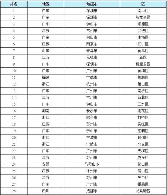 此外,2017年首次评价的工业百强区分布于16个省(自治区)。主要集中于江苏、广东、山东、浙江等工业大省,其中,江苏25个,广东18个,山东12个,浙江10个,四省合计65个。此外,湖南、四川各6个,湖北5个,福建4个,陕西3个,内蒙古、安徽、广西、辽宁各2个,河北、江西、云南各1个。十强依次是南山区、新龙岗区、顺德区、武进区、南海区、江宁区、黄岛区、新区(无锡)、新宝安区和黄埔区。工业百强区发展呈现工业规模继续扩大、工业增速有所放缓,新旧动能转换趋势向好、战略性新兴产业逐步壮大,供给侧结构性改革效果明显、创新能力有待于提升等特点。