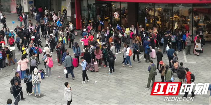 4月28日清晨,阿波罗商业广场前坪聚集众多去张家界、凤凰、韶山等地的游客。