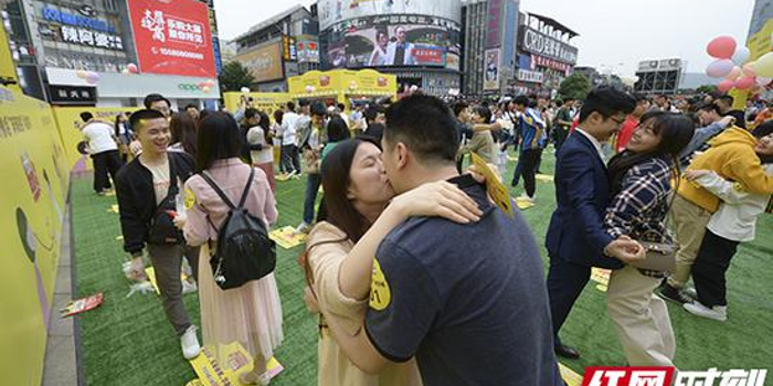 5月20日下午5时20分,在长沙黄兴广场,52对情侣共吃1.314米辣条进行爱的告白。