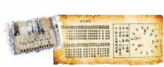 △1937年,健雏幼稚园全体师生合影,邹德惠位于后排右一。 ▶《老虎敲门》的儿歌与游戏图例。