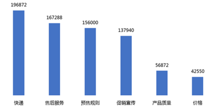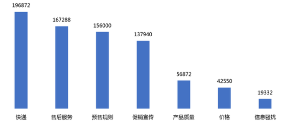 哪些问题最集中?监测期内,快递、售后服务、预售规则、促销宣传、产品质量、价格和信息骚扰等方面问题较多。其中,快递、售后服务、预售规则和促销宣传方面的负面信息均超过10万条。