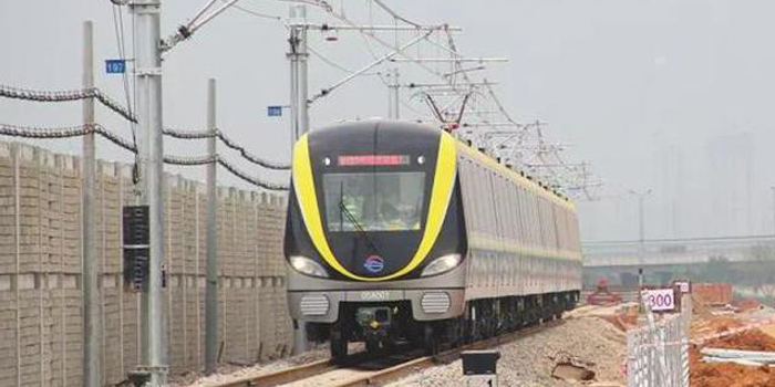 地铁5号线车辆色带颜色为其线路色——黄色,在长沙地铁5号线水渡河车辆段,一列明黄色涂装的地铁列车正在进行热滑试验,对供电、信号、通信、机电等系统设备进行综合测试。
