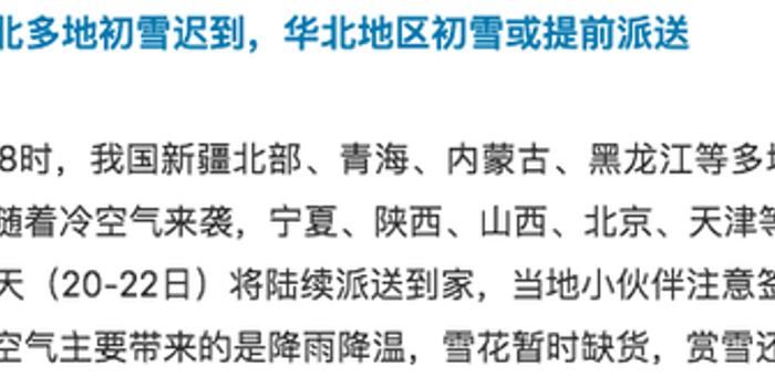 长春、呼和浩特、沈阳等地都已在这轮过程中“签收”初雪,华北、西北一些地方的初雪也已“发货”。