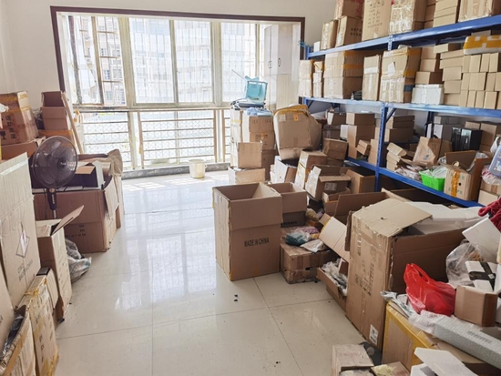 4 月 11 日,潇湘晨报记者来到事发住房查看,发现该房的客厅一侧摆放着货架,两侧墙壁旁均摆满了堆叠起来的货物,包括陶瓷制品、松香以及各种小瓦楞纸盒包裹的商品。阳台左侧上方的墙面和下水道管已被烧焦,该侧的窗户玻璃也已崩碎,而阳台地面和靠近地面的墙面和玻璃没有明显破损,地面上剩下了一块松香、两支油性笔和少量灰烬。