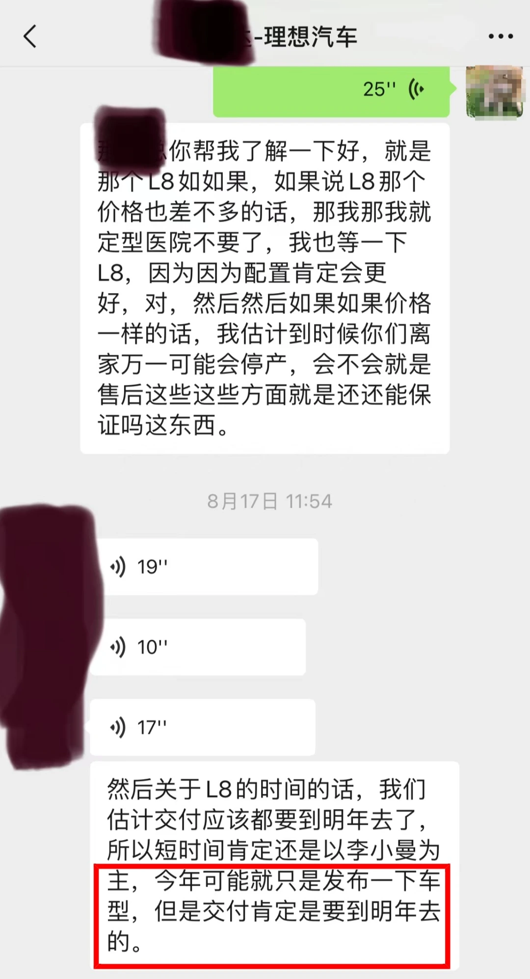 “当时销售和我说购车会有7000元补贴,只有5个名额。”基于优惠,陈先生便定了车,并支付了5000元定金。次日,陈先生得知理想ONE在今年可能会出新款理想L8,便向销售咨询理想L8的相关情况。8月17日,销售人员答复陈先生“L8的交付肯定要到明年。”