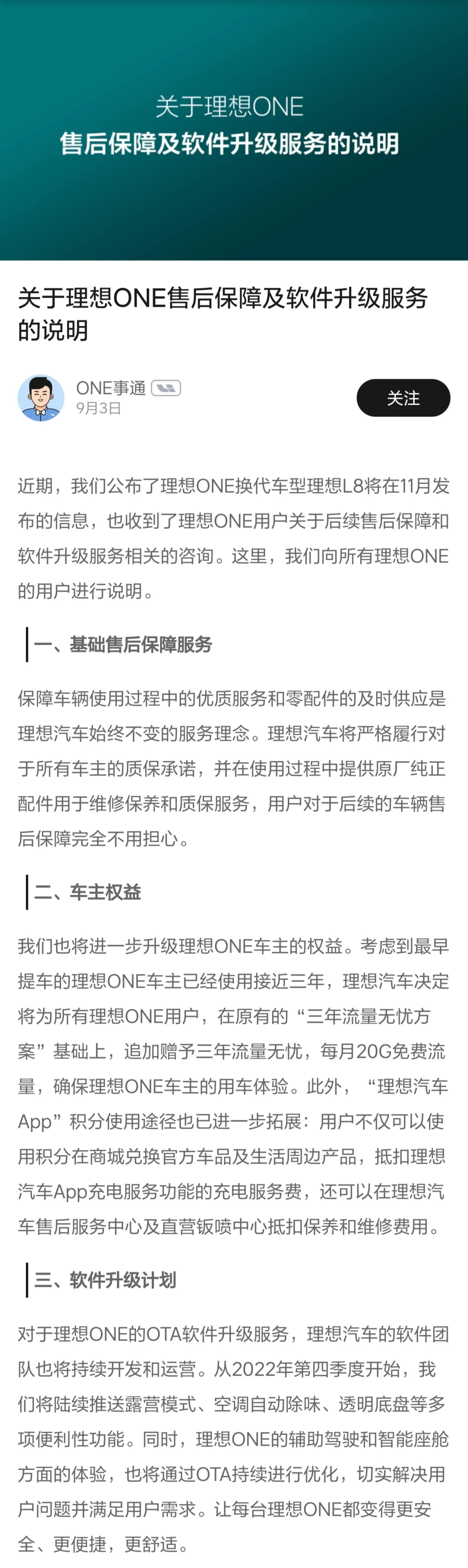 9月3日,通过理想汽车App,理想汽车对外发布了“关于理想ONE售后保障及软件升级服务的说明”,声明中对基础售后保障服务、车主权益、软件升级计划三部分进行了说明:理想汽车将严格履行对于所有车主的质保承诺,并在使用过程中提供原厂纯正配件用于维修保养和质保服务,用户对于后续的车辆售后保障完全不用担心。对于理想ONE的OTA软件升级服务,理想汽车的软件团队也将持续开发和运营。理想汽车决定将为所有理想ONE用户,在原有的“三年流量无忧方案”基础上,追加赠予三年流量无忧,每月20G免费流量,确保理想ONE车主的用车体验。