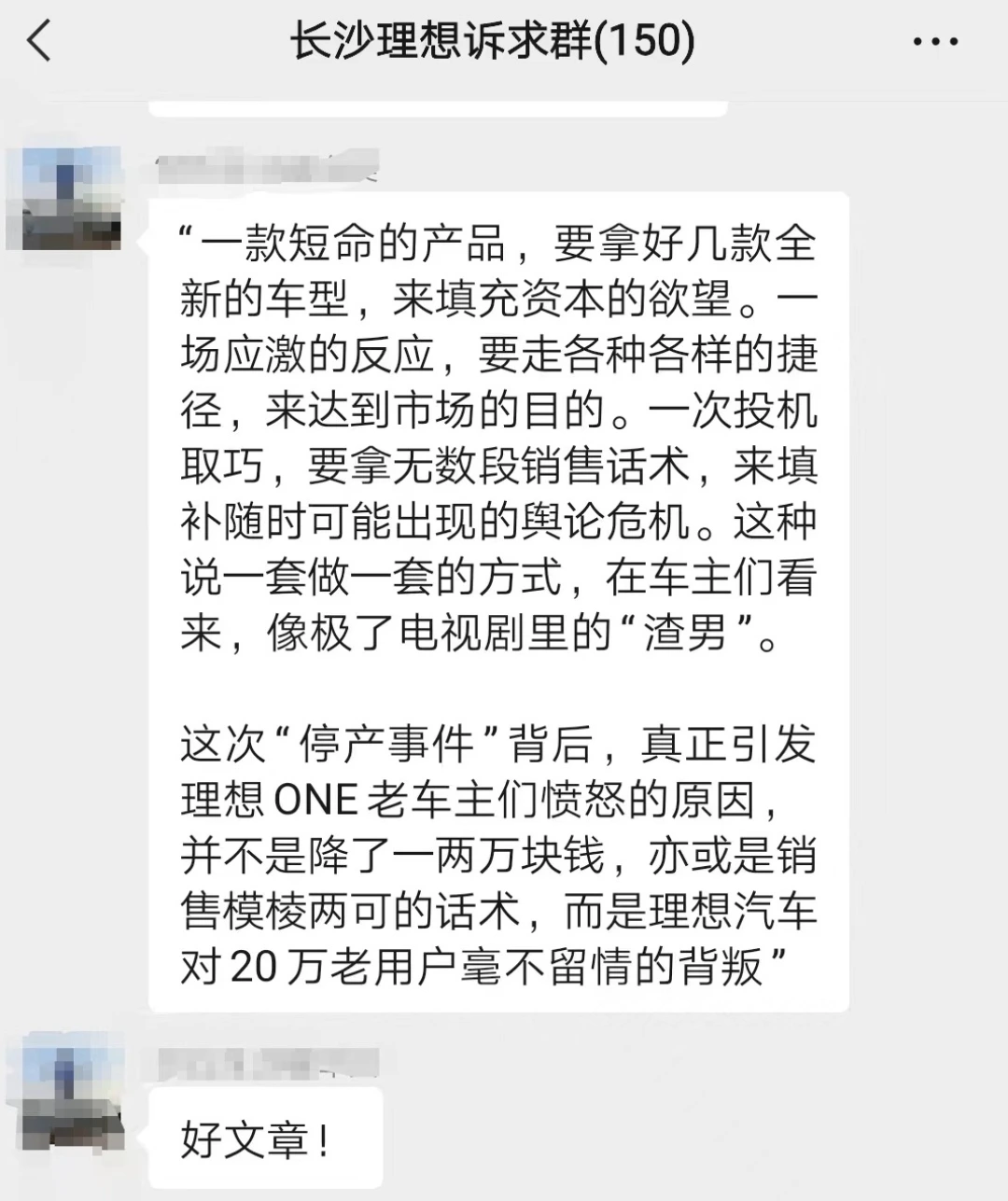 随着越来越多的车主知道理想ONE降价并将停产的消息,不满情绪在车主之间蔓延扩散,维权的规模不断扩大。“长沙理想ONE车主维权的人,目前我们知道的就有150人”,车主王先生介绍。
