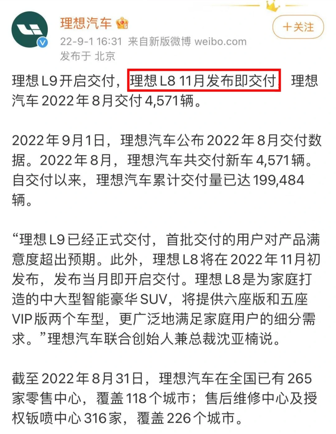 据理想汽车官方微博9月1日消息,“理想L8 11月发布即交付。”