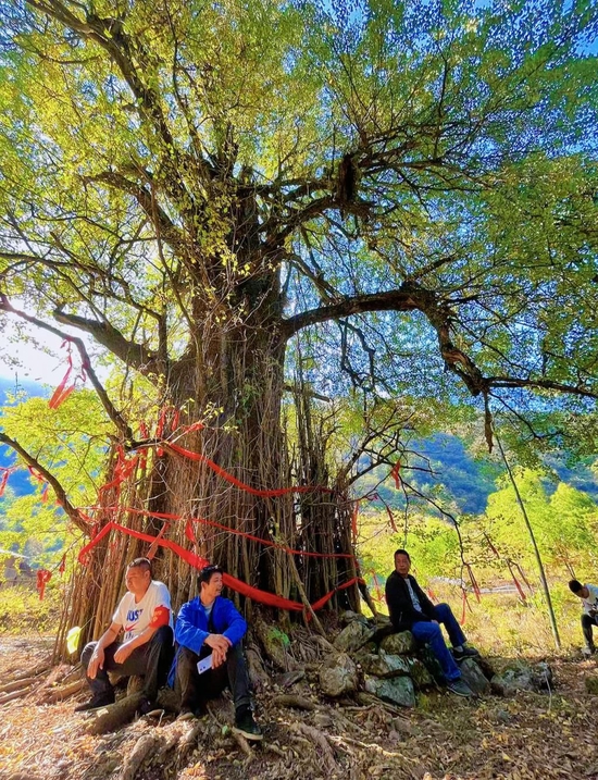 我是霜降之前见到它们的,银杏树叶还在浅黄和深绿之间过渡,叶子之间细细密密,看不出它摄人心魄的美。去年厚厚的落叶仍在,踩在上面凑近树干底部,抬头仰望,银杏树冠就像一把撑向天际的巨伞,细碎的阳光透过叶片缝隙洒落,一切显得那么静谧、柔和,有种恍若隔世的美好。村民们围着大树转了一圈,将散乱的石头垒好,再撤去捆绑它们的红绸子,就像呵护家中的长辈般细致。