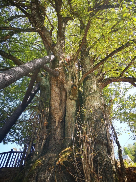 古银杏树长在一处陡坡上,有种傲视丛林的威严。它周身绑了树撑,旁边修葺护栏栈道,还设了观景亭台,已经是一处古银杏公园。这棵历经沧桑的古银杏,有着巨大的树蔸,光胸径就有 3.84 米,需要十多个成年人环抱。原本这棵古树有 60 多米高,明末清初,一场雷击将它的树干拦腰击断,撕裂至根际,树梢架落在距树蔸 50 多米远的山包上,如一架天桥。几百年过去,住在银杏树旁的村民在斜坡下挖鱼塘,还见到一截巨大的树干。它的主干已经空心,底部形成一个宽敞的门洞,四面透风,只剩下树皮裹身。尽管如此,它又顽强地从断裂的主干处长出 7 棵参天大树。如今,我们看到的古银杏树矮了一大截,只有 25 米。“ 古银杏树空心的地方真的很宽敞,可容下 20 多人,我一个伯伯上世纪七八十年代将树洞用土填高一米,做成猪舍,还在树洞里关牛养猪。”47 岁的村民吴又红说,银杏树洞是 2021 年建古银杏公园时填上的,在此之前,还能在树洞里看到雷击后的痕迹。