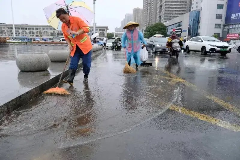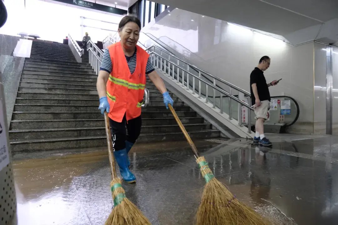 芙蓉区环卫工作人员、巾帼志愿者带着扫帚迎雨而上,在火车站地下过道奋力排水。
