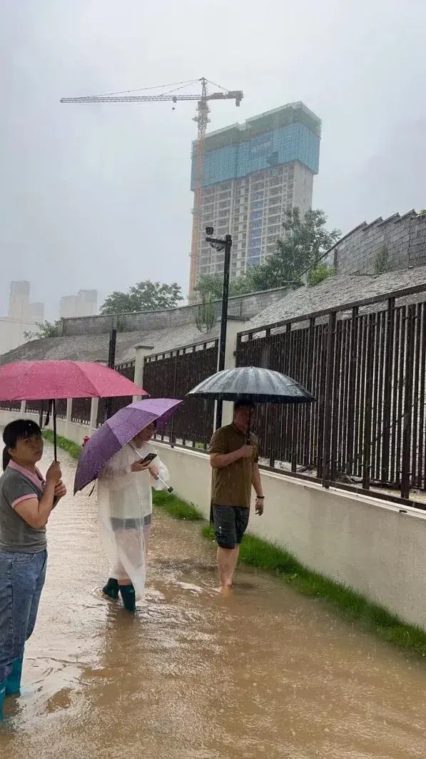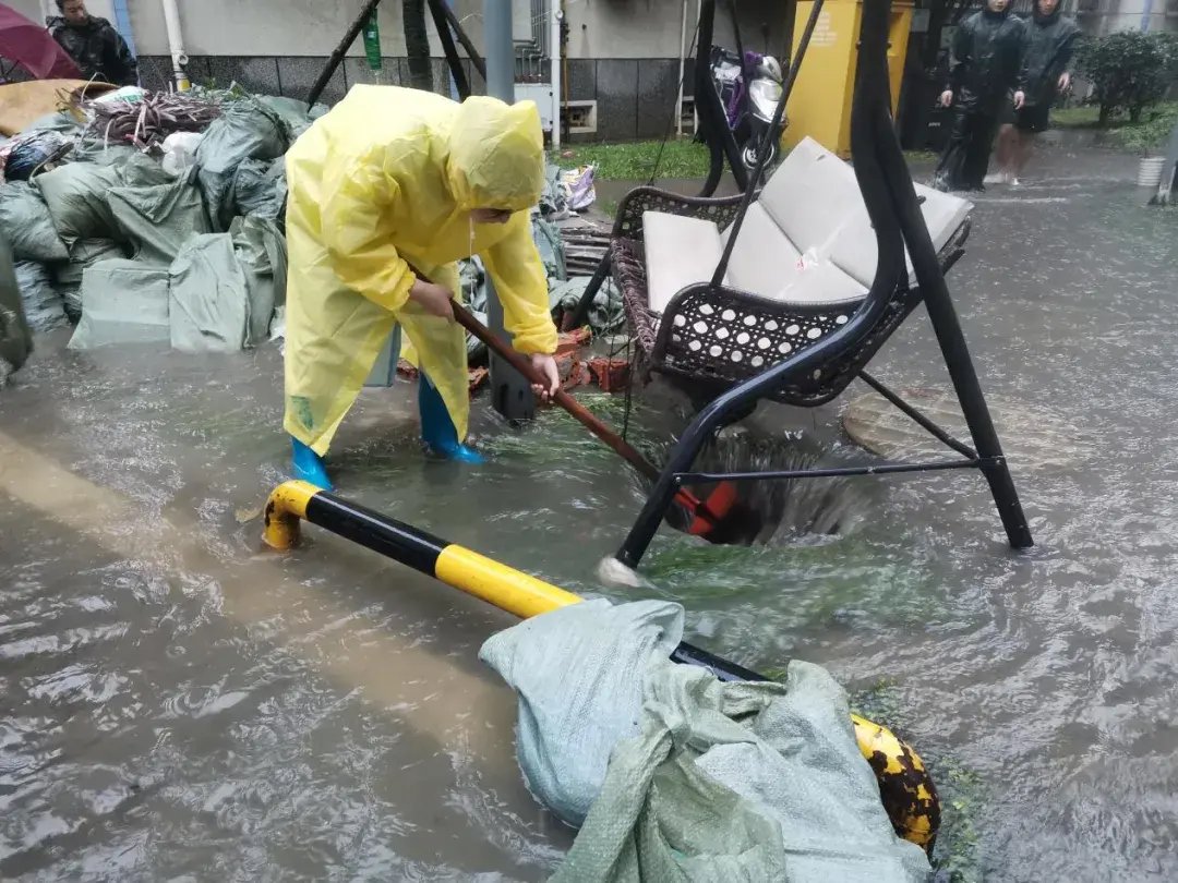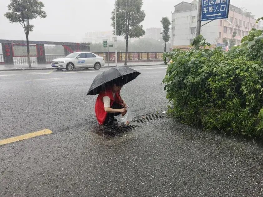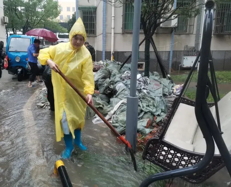 迎着暴雨,雨花区金盾社区妇联主席许文君快速赶到雨水淤堵的居民楼,用铲子清理着积水;妇联执委刘玉姗奔赴洞井路,用手泡在水中,抠沟盖板,疏通积水。