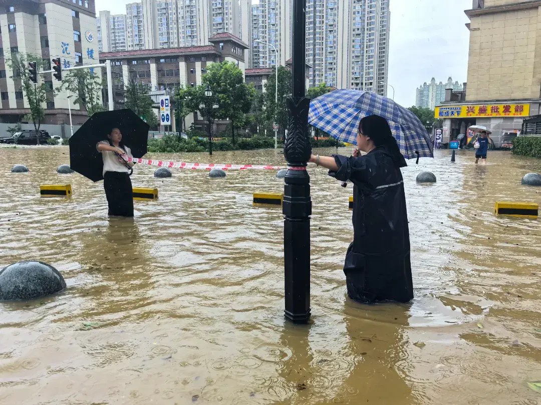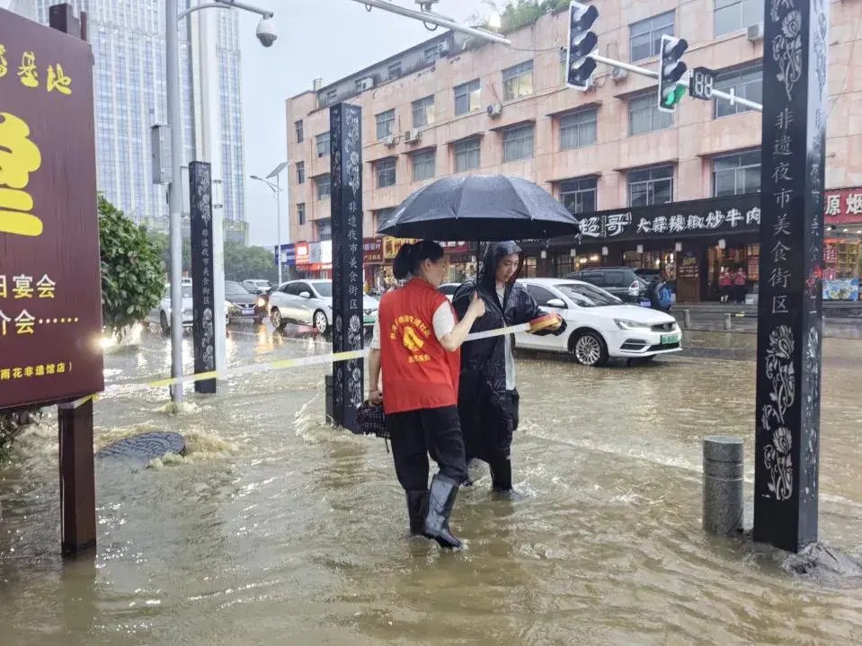 在株洲,石峰区响石岭街道白石港社区的白石港老河街处,风光带游道和居民区部分道路被水淹没,社区网格员和巾帼志愿者在通往老河街的路口处值守,在相关路段拉起警戒线,在路口处进行值守,劝导行人和车辆。