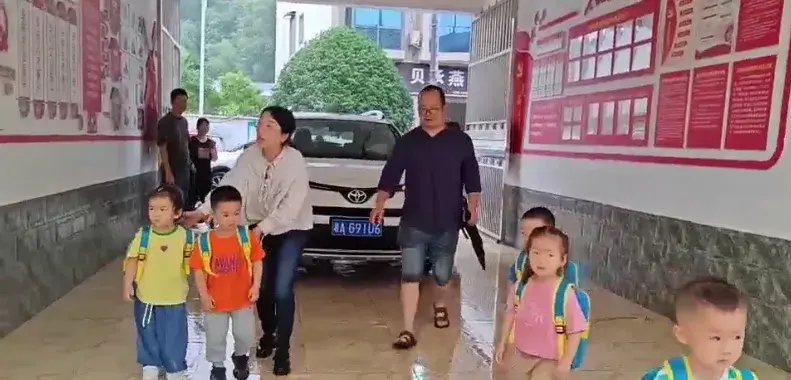 浏阳市高坪镇副镇长刘榴(白色上衣)带领镇干部将石湾附属幼儿园小朋友安全转移到村委会。