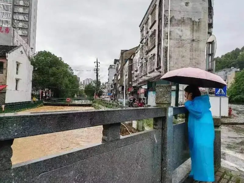 在岳阳,岳阳县张谷英镇风水村联村干部和村妇联主席张雪瑶在佛坳水库巡查,对水库下游居民进行劝导和转移。