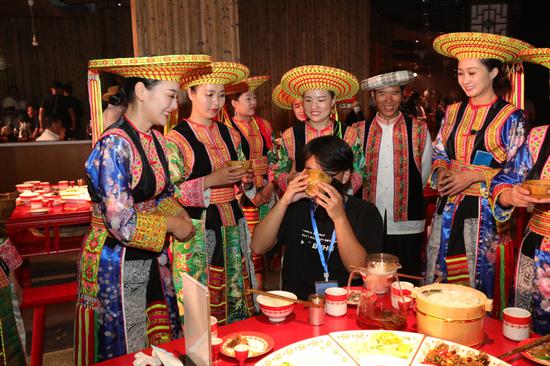 《花瑶喜宴》被誉为中国首个沉浸式艺术感官怪诞喜剧,以花瑶怪诞婚俗为切口,聚焦花瑶人的衣食住行、繁衍生息、喜怒哀乐,首创集“视、听、触、感、闻”于一体的沉浸式“五感”喜宴模式,打破秀演、编剧、场景、餐饮、表演、消费的边界,将场地由内而外进行全景改造升级,创新规划演出场景和内容。品鉴活动中,观众由前坪至大厅,再至宴厅,沉浸式参与迎亲交互、火堂屋打卡、怪诞喜宴,感受非同一般的艺术享受。