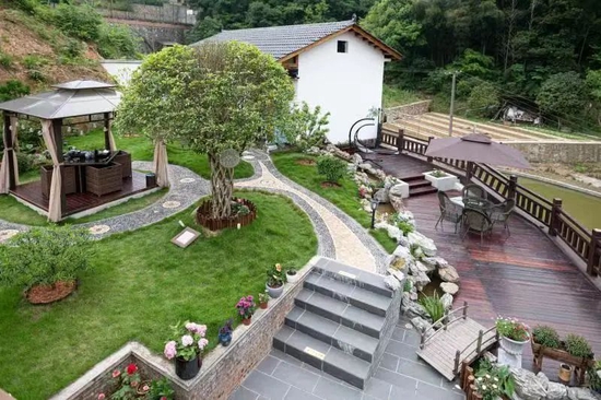屋前庭院,花草作伴,秋千躺椅,甚是悠闲。