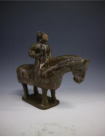 甲骑具装俑即武士与战马均着铠甲的重骑兵。人马通体施黄褐色釉,上绘白色条纹。骑兵头戴兜鍪,身披铠甲,左手握缰,右手执物,昂首挺胸,目视前方,英俊威武。战马头戴面帘,全身披铠,铠甲装饰纹与武士一致,威风凛然。