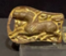 鎏金铜质,应为鲜卑革带的带头,马蹄形,头部开孔,以节约带尾。带头上浮雕马纹,马昂首扬尾,四蹄腾空,作奔驰状。鲜卑墓常见此类带扣,且多成对使用。