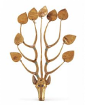 此件金步摇的鹿头面和角是以范浇铸而成。鹿面额较宽,颊内收,嘴角向外撇,吻部平整。两鹿角中间有一鹿角形支叉,先由一个主根生出两个支根,再向上分为四个小支叉,每小支叉梢均有一金环,每个枝梢挂桃形金叶一片,每片金叶均可摇动。