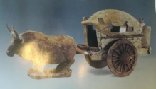 泥质灰陶,模制。牛曲颈伫立,头戴红色笼套,瞪目闭嘴,双角弯曲。鳖甲车车盖呈椭圆形,顶部隆起似鳖甲,车厢两侧各开窗两个。顶部和底板素面,其余的厢体外表均用黑色粗线条饰长方形图案。车厢后方开门两扇,里侧遍涂红色。车轮遍施黑色。