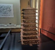 永宁寺中心建筑为九层木塔,高“四十九丈”,即136.71米。考古发掘表明,塔基高出地面8米,平面呈方形,分为二层,边长38.2米,高2.2米,内为夯土,四壁以青石镶包。木塔毁于永熙三年(公元534年)雷电引起的一场大火,其塔基是目前我国经全面发掘的唯一一座北魏佛寺遗址。
