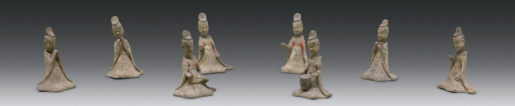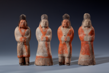 泥质彩陶,左起一、三为男侍俑,分别着红边白襦和白边红襦,头戴黑色垂裙帽,帽顶聚圆,帽裙及肩。身穿左祍交领窄袖长褥,腰间束带,下着窄腿裤。左起二、四为女侍俑,分别着红边白襦和白边红襦,头戴黑色垂裙帽,帽上有“十”字形阴刻图案,帽裙垂至肩部,帽与帽裙间扎带系结于帽后部。身着左祍交领窄袖长褥,下着素色曳地长裙。