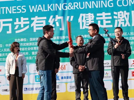 接下来,由武陵源区委宣传部部长龚新河作为武陵源区联动城市代表,向上海崇明区体育局副局长俞永峰传递联赛会旗及火炬。