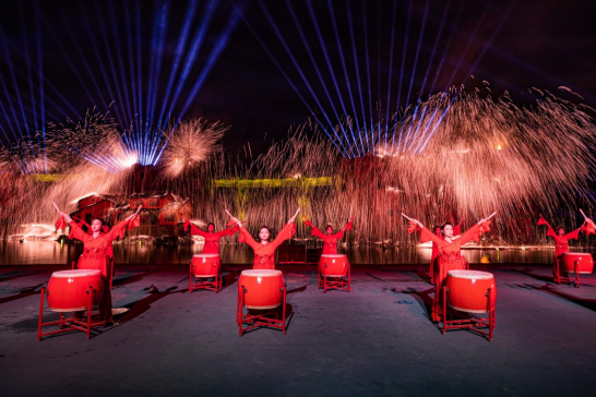 当夜幕降临,道林古镇便开启了另一场震撼人心的视觉奇迹。大型山水实景演出震撼上演,灯光、音乐与自然背景完美融合,如梦如幻;传统非遗打铁花表演点亮夜空,火花如雨般洒落,灿若星河,令人叹为观止。