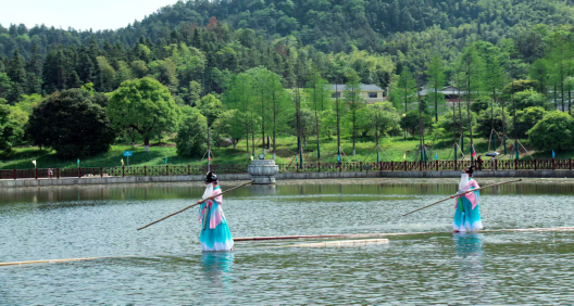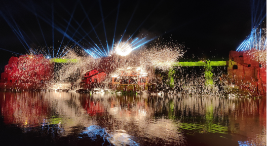 景区通过夜间实景沉浸式大剧、室内小微剧、道路巡游、水上演出等多种形式演绎湖南地方传统文化故事,其中晚上大剧《千年铁魂·湖南人》,百名打铁匠人在夜空中舞动1600多摄氏度高温铁水后形成的漫天铁花的景象,蔚为壮观。