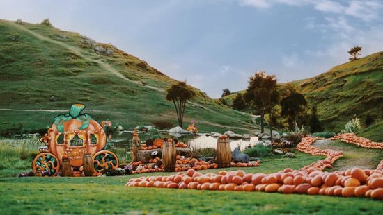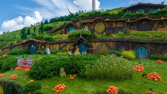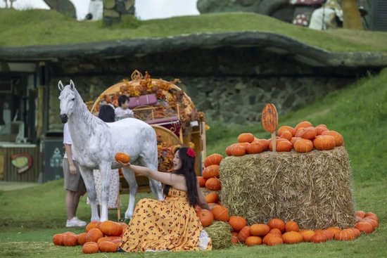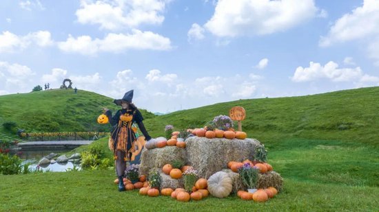 走进霍比特城堡区域,就像突然闯入了童话世界。小屋门前、窗台上堆放着南瓜,城堡前的广场设立着南瓜塔,以天空、草原为背景,秒拍出森系大片。