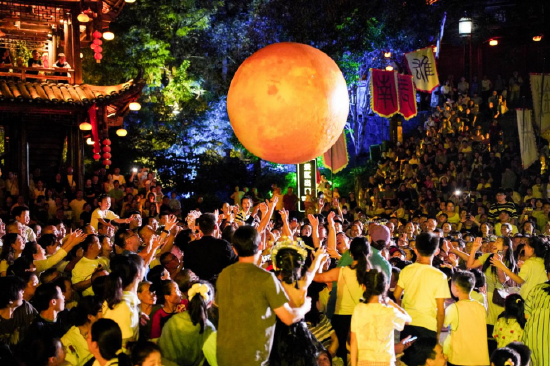 摆手堂里人头攒动,座无虚席,《欢迎来到芙蓉镇》音乐短剧引爆全场,会freestyle的“嫦娥”,自带笑点的“金刚芭比兔”,从天突降的“月亮”,瞬间点燃全场热情!