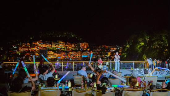 乐队激情开唱,澎湃音浪彻底把古镇的热情点燃,荧光棒挥舞成流动的星河,观众跟着节拍摇晃,有人站起来跳舞,有人跟着放声合唱,每个人都在音乐里尽情释放自我,这股 “红” 透夜色的热闹让谁都舍不得提前散场!