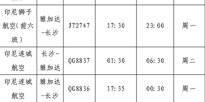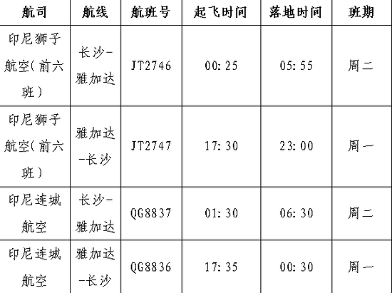 根据航班计划,长沙至雅加达航线自12月22日起执行,每周一班。前六个班次由印尼狮子航空执飞,后续由印尼连城航空接续运营,使用B737-8与A320NEO机型,飞行时长约5.5小时(以航空公司发布为准)。
