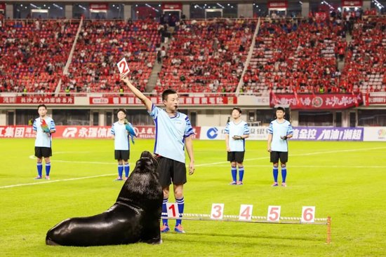 堪称2025“体旅融合”顶级流量的湘超联赛。大王山将文旅的叙事,巧妙地编织进了体育的激情。开场哨响之前,预言已然登场。来自湘江欢乐海洋公园的明星海狮“洋洋”,以一次精准的“2-0”比分预测,化身“长沙版章鱼保罗”,瞬间点燃全场,成为赛事的第一个“高光时刻”。紧随其后的,是一场打破次元壁的巡游:骏马开道,海洋主题花车缓缓驶入,五大主题方阵载着身着人鱼华服的演员与巨大的海洋生物彩车,将绿茵场瞬间变为奇幻的深海王国。