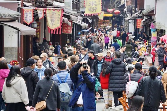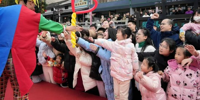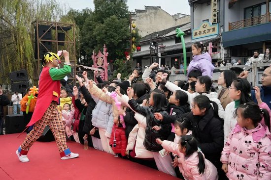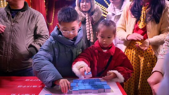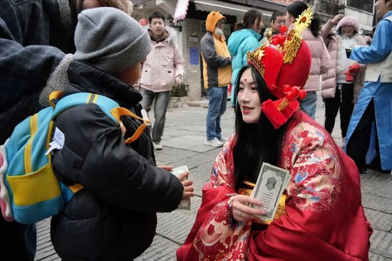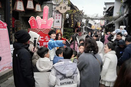 更让人欣喜的是,老长沙民俗文化通过创新形式焕发新生机。“靖港太好玩了!”成为孩子们说的最多的话。萌娃们在定向寻宝中化身“小探险家”,在射箭、投壶、踢毽子、锤钉子等传统游戏里赚饱了商票;全家一起猜灯谜、做糖画、体验手工制作乐开了花,传统年俗在互动体验中变得鲜活可触。街巷中,福禄寿喜“吉祥四宝”、派发好运的财神等NPC天团,为游客送福气惊喜互动,不少家长赞叹道:“孩子追着财神跑了半条街,这种沉浸式体验太有意思了。”
