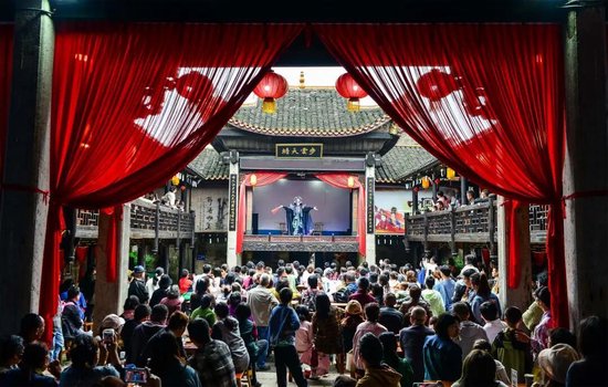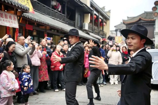 靖港古街张灯结彩、处处是戏、人流如织,洋溢着节日的欢声笑语。楚河码头化身开放式舞台,“潮韵戏元旦”联谊派对嗨不停,魔术、劲舞、旗袍秀与乐队表演轮番登场,台下全家老小随着音乐一起摇摆;八元堂里湘韵悠扬,变脸喷火绝技赢得阵阵喝彩,孩子们兴奋举着手机拍照;黄金年代剧场的复古派对乐翻天,陶承故居里演绎着“革命母亲”感人至深的大爱,古桥上湘韵戏影演绎东方美学,老街中喜嫁迎亲传递着喜悦……非遗民俗与当代演艺在满镇自然生长,全域漫游、步步皆景,真正实现了“满镇都是戏”的畅快体验。