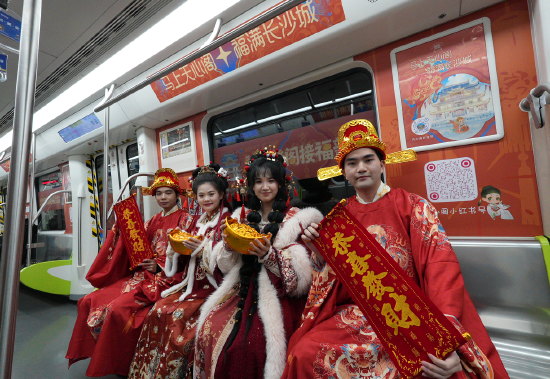 下午,一列装饰一新的天心阁主题列车从长沙地铁3号线广生站缓缓驶出。车厢内,身着华服的“财神爷”手持金元宝与福袋,与乘客热情互动,派发“新年金币”,邀请广大游客春节来天心阁接福接好运。