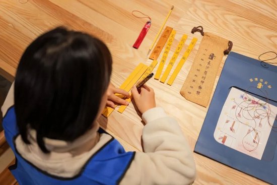 纸上得来终觉浅,绝知此事要躬行。为让青少年更直观地感受简牍文化的魅力,活动设置了“书于竹木”手工体验环节,将抽象的历史知识转化为可实践、可创造的沉浸式体验。工作人员为每位青少年发放了竹简、秀丽笔、编绳等教育包,孩子们亲手触摸竹简的粗糙纹理,模仿古人的书写姿势,在简片上一笔一划写下经典文字,随后学习用编绳将简片串联成册,亲手制作属于自己的“简牍”。